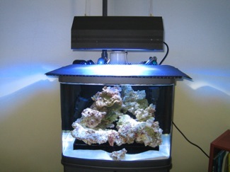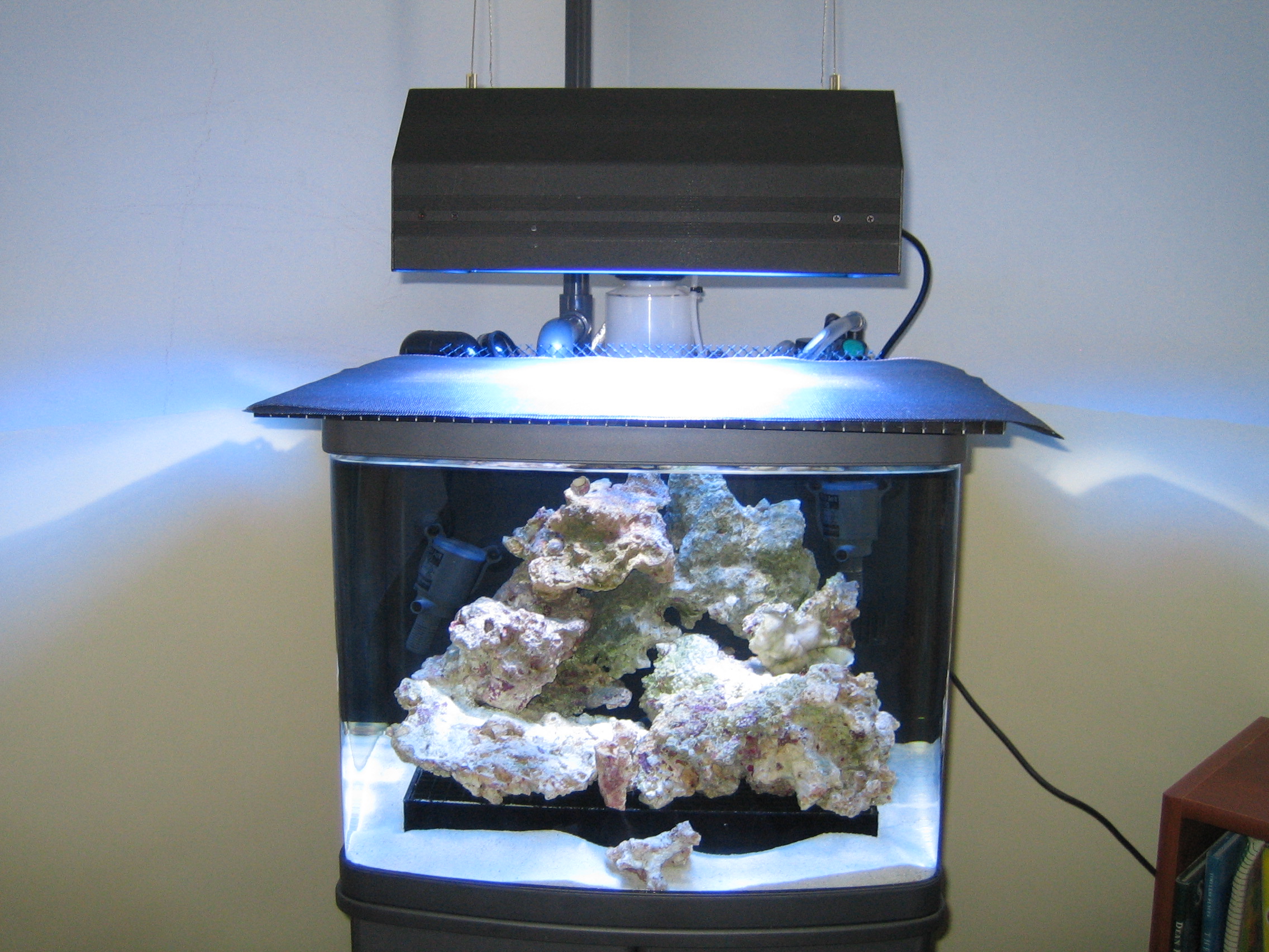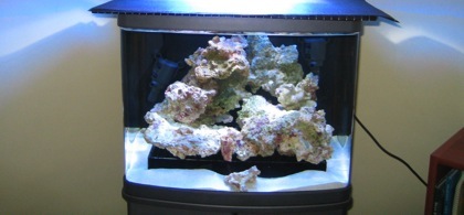 This aquarium was actually started July 2007. I have done many modifications to this BioCube in the goal of growing an SPS aquarium in a small tank. I started by building a 3 sided raised platform on the bottom of the tank. about 2in. high topped by black egg crate. I originally put sand all around that but it was always blew away from the front staying only on the sides so I reduced the amount of sand and used a larger size (1mm to 2mm grain size). The following set of pictures I will show the modifications that worked.